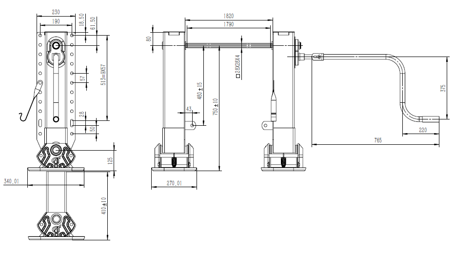 Опорные устройства (комплект, 2шт) с валом и ручкой, стопа S, L=750 (Грузоподьемность: статическая - 50т, динамическая - 24т. Высота - 750 мм, подъем - 505 мм, вал - 1500); BS75