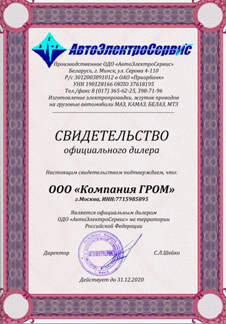 ООО «Компания «ГРОМ» - российско-белорусское предприятие, поставщик запчастей для грузовых автомобилей МАЗ, МЗКТ, а также автобусов МАЗ. Мы являемся официальными дилерами ООО "МЗТА" (г.Минск), ОДО "АвтоЭлектроСервис" (г.Минск), официальным представителем ОАО "Радиотехника (г.Ошмяны), УЧПП "КУВО" (г.Могилев). Cпециалисты компании имеют богатый опыт работы с автозапчастями данного направления.